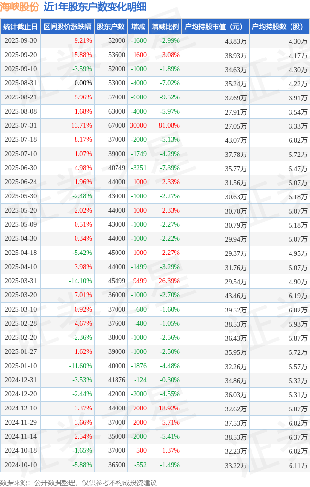 从股价来看,2025年9月20日至2025年9月30日,海峡股份区间涨幅为9.21%,在此期间股东户数减少1600.0户,减幅为2.99%。