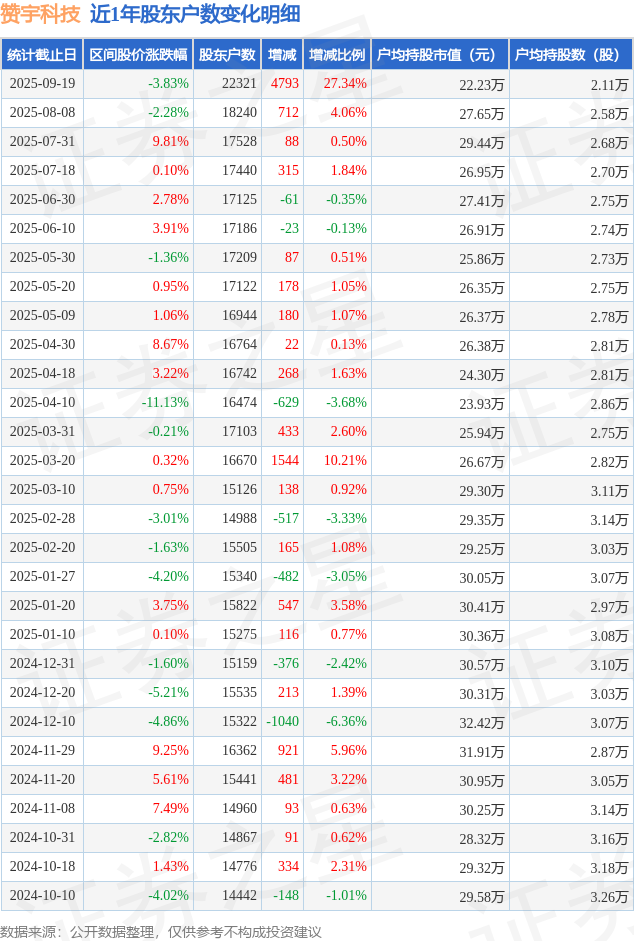 从股价来看,2025年7月31日至2025年9月19日,赞宇科技区间跌幅为3.83%,在此期间股东户数增加4793.0户,增幅为27.34%。