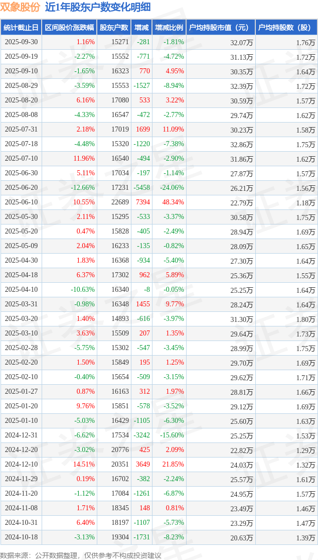 证券之星消息,近日双象股份披露,截至2025年9月30日公司股东户数为1.53万户,较9月19日减少281.0户,减幅为1.81%。户均持股数量由上期的1.72万股增加至1.76万股,户均持股市值为32.07万元。