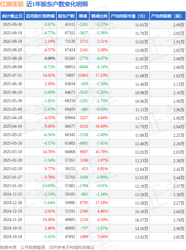 从股价来看,2025年9月19日至2025年9月30日,红旗连锁区间跌幅为3.97%,在此期间股东户数减少2201.0户,减幅为3.27%。