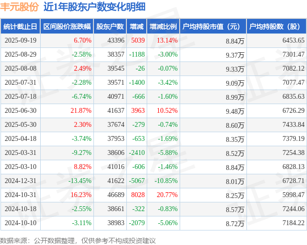 从股价来看,2025年8月29日至2025年9月19日,丰元股份区间涨幅为6.7%,在此期间股东户数增加5039.0户,增幅为13.14%。