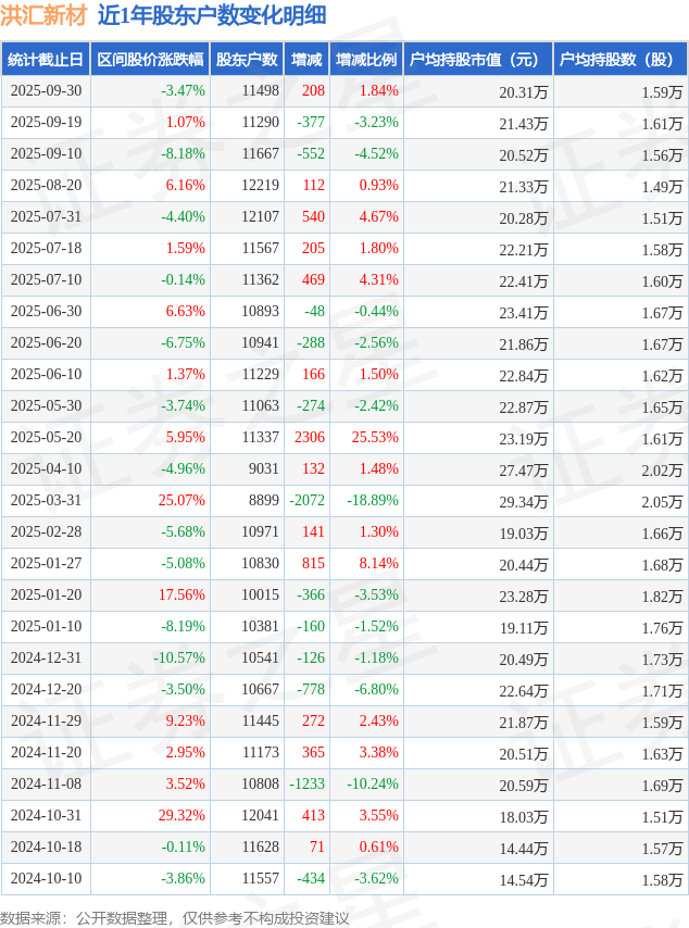从股价来看,2025年9月19日至2025年9月30日,洪汇新材区间跌幅为3.47%,在此期间股东户数增加208.0户,增幅为1.84%。