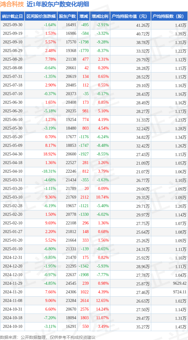 从股价来看,2025年9月19日至2025年9月30日,鸿合科技区间跌幅为1.64%,在此期间股东户数减少495.0户,减幅为2.91%。