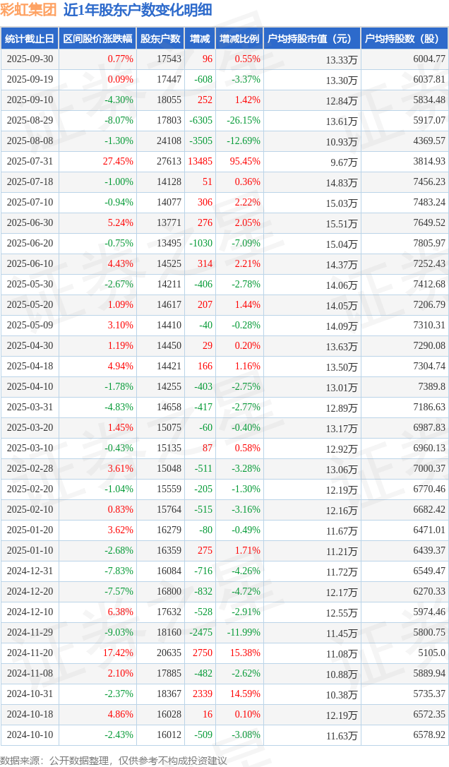 从股价来看,2025年9月19日至2025年9月30日,彩虹集团区间涨幅为0.77%,在此期间股东户数增加96.0户,增幅为0.55%。