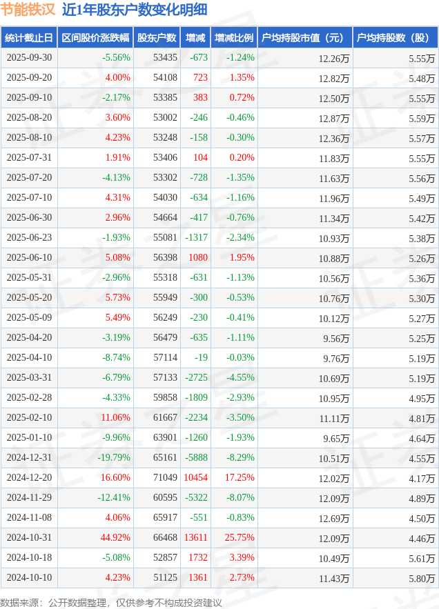 从股价来看,2025年9月20日至2025年9月30日,节能铁汉区间跌幅为5.56%,在此期间股东户数减少673.0户,减幅为1.24%。