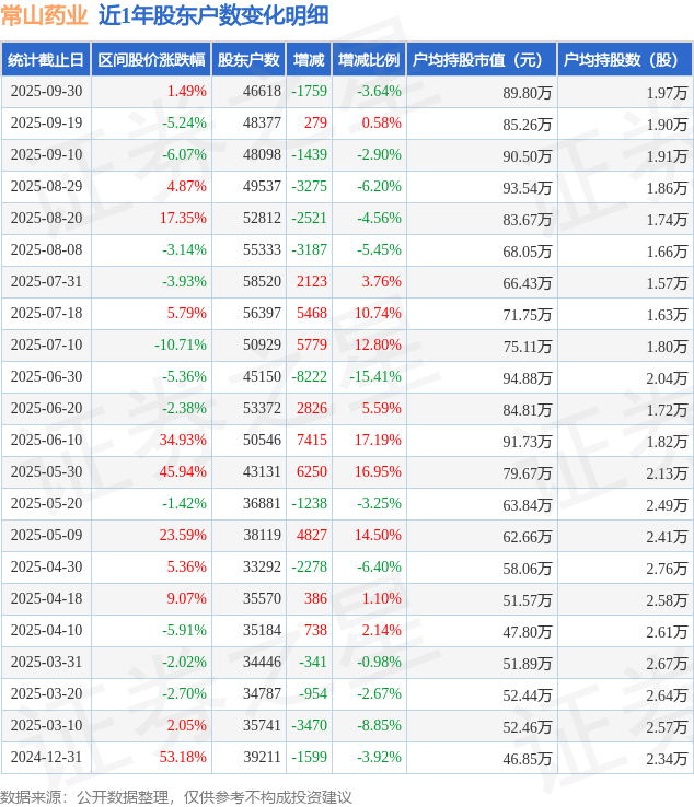 从股价来看,2025年9月19日至2025年9月30日,常山药业区间涨幅为1.49%,在此期间股东户数减少1759.0户,减幅为3.64%。