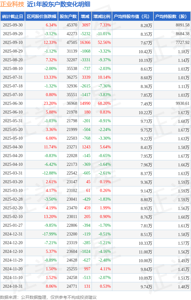 从股价来看,2025年9月20日至2025年9月30日,正业科技区间涨幅为6.34%,在此期间股东户数增加3097.0户,增幅为7.33%。