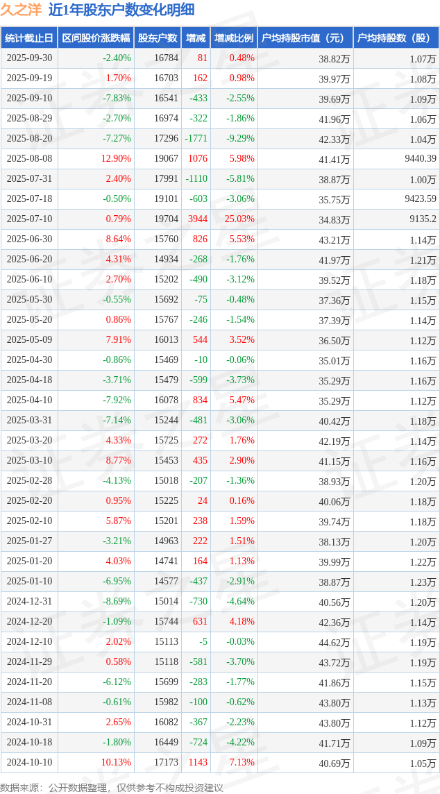 从股价来看,2025年9月19日至2025年9月30日,久之洋区间跌幅为2.4%,在此期间股东户数增加81.0户,增幅为0.48%。