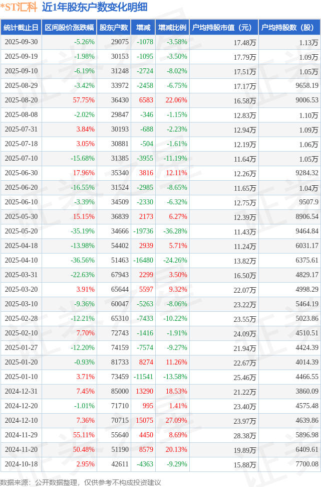 从股价来看,2025年9月19日至2025年9月30日,*ST汇科区间跌幅为5.26%,在此期间股东户数减少1078.0户,减幅为3.58%。