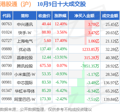 证券之星消息,10月9日,恒生指数跌0.29%,报收26752.59点。当日南向资金净买入30.433亿港元,交易所公布的港股通(沪)十大成交股中,净买入个股共5只,净买入金额最多的是中兴通讯,净买入3.78亿港元,净卖出个股共5只,净卖出金额最多的是阿里巴巴-W,净卖出7.51亿港元。详情可见下表: