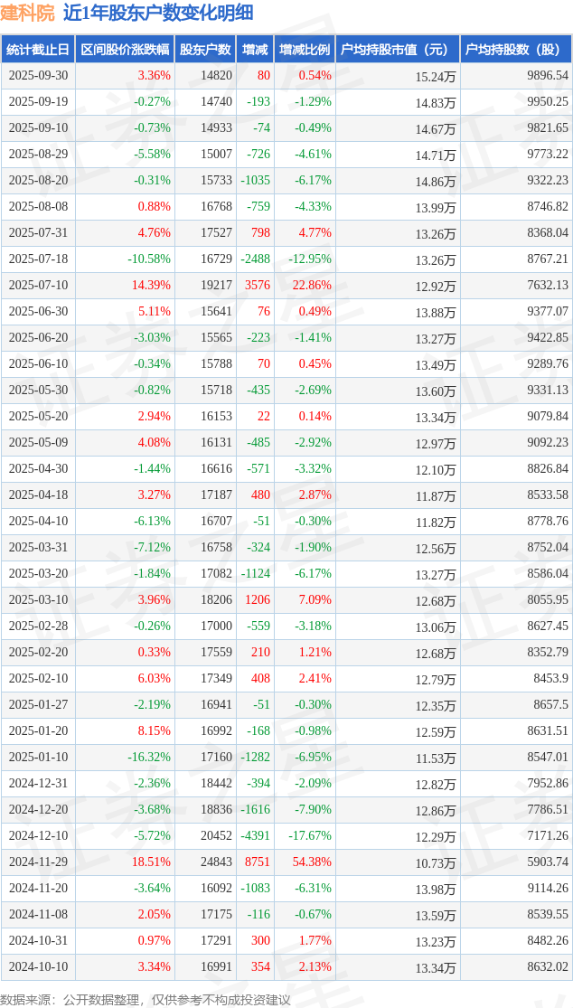 从股价来看,2025年9月19日至2025年9月30日,建科院区间涨幅为3.36%,在此期间股东户数增加80.0户,增幅为0.54%。