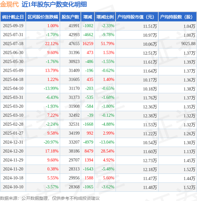 从股价来看,2025年7月31日至2025年9月19日,金现代区间涨幅为1.0%,在此期间股东户数减少1002.0户,减幅为2.33%。