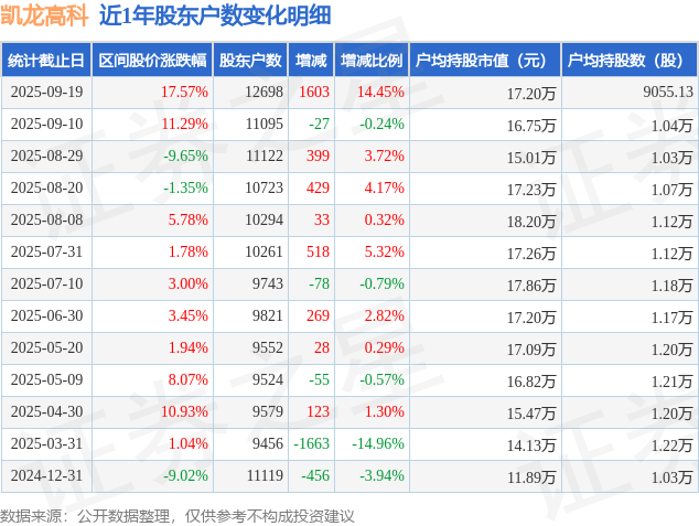 从股价来看,2025年9月10日至2025年9月19日,凯龙高科区间涨幅为17.57%,在此期间股东户数增加1603.0户,增幅为14.45%。