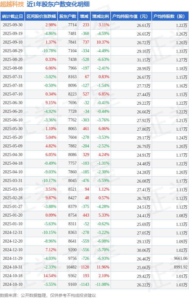 从股价来看,2025年9月20日至2025年9月30日,超越科技区间涨幅为2.98%,在此期间股东户数增加233.0户,增幅为3.11%。