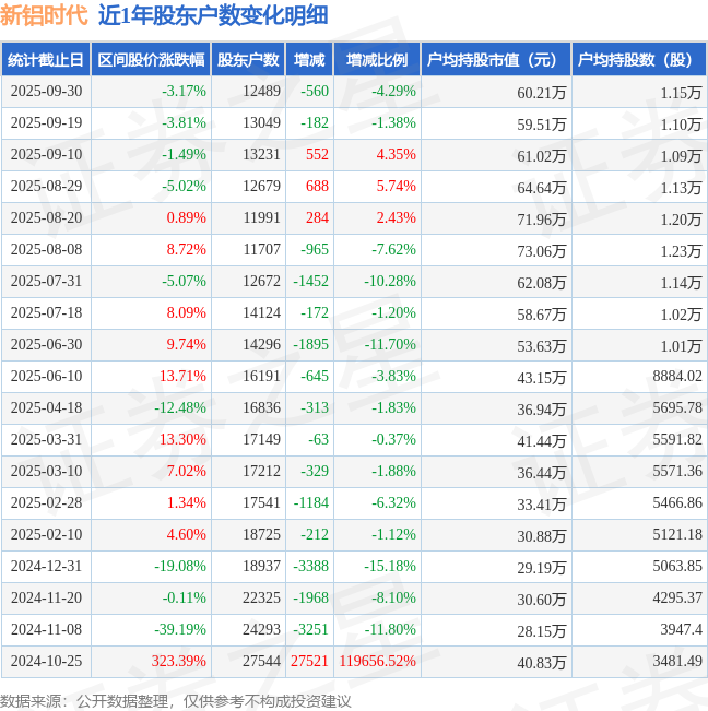 从股价来看,2025年9月19日至2025年9月30日,新铝时代区间跌幅为3.17%,在此期间股东户数减少560.0户,减幅为4.29%。