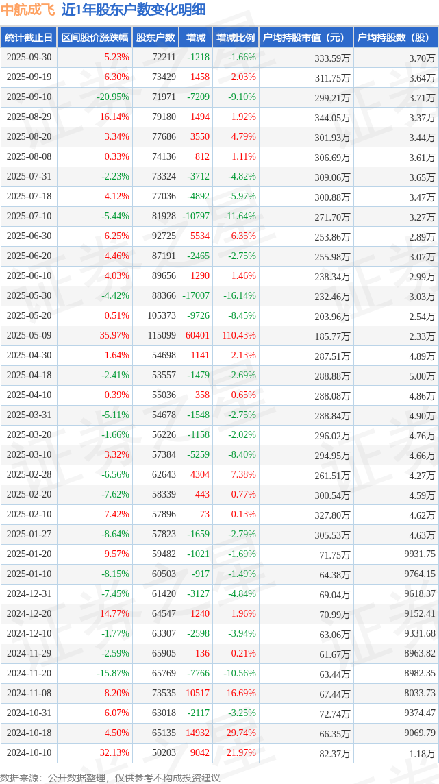 从股价来看,2025年9月19日至2025年9月30日,中航成飞区间涨幅为5.23%,在此期间股东户数减少1218.0户,减幅为1.66%。