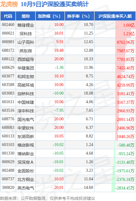 龙虎榜中有沪股通/深股通专用席位(北向资金)现身的个股共23家,其中赣锋锂业以净买入1.6亿元排名第一。详情见下表: