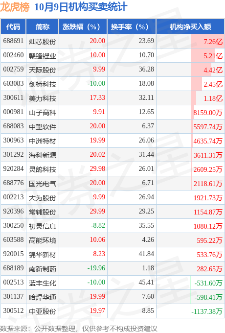 当日公布的交易所龙虎榜中有机构专用席位现身的个股共31家,其中灿芯股份以净买入7.26亿元排名第一。详情见下表: