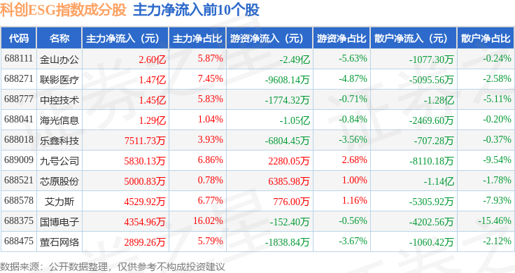 资金流向方面,科创ESG(000691)指数成份股当日主力资金净流出合计11.66亿元,游资资金净流入合计6.06亿元,散户资金净流入合计5.6亿元。成份股资金流向详情见下表: