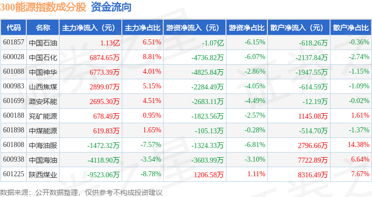 资金流向方面,300能源(000908)指数成份股当日主力资金净流入合计1.67亿元,游资资金净流出合计3.09亿元,散户资金净流入合计1.41亿元。成份股资金流向详情见下表: