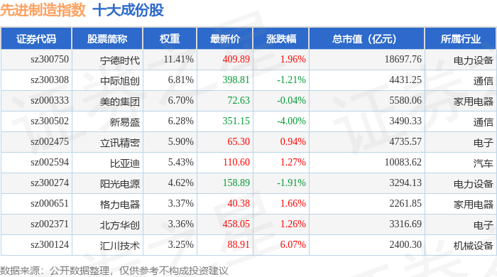 证券之星消息,10月9日,先进制造(399260)指数报收于3857.5点,涨1.68%,成交2691.6亿元,换手率3.06%。当日该指数成份股中,上涨的有39家,赣锋锂业以10.0%的涨幅领涨,下跌的有10家,新易盛以4.0%的跌幅领跌。