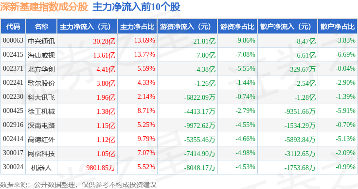 资金流向方面,深新基建(399274)指数成份股当日主力资金净流出合计1.59亿元,游资资金净流出合计19.01亿元,散户资金净流入合计20.59亿元。成份股资金流向详情见下表: