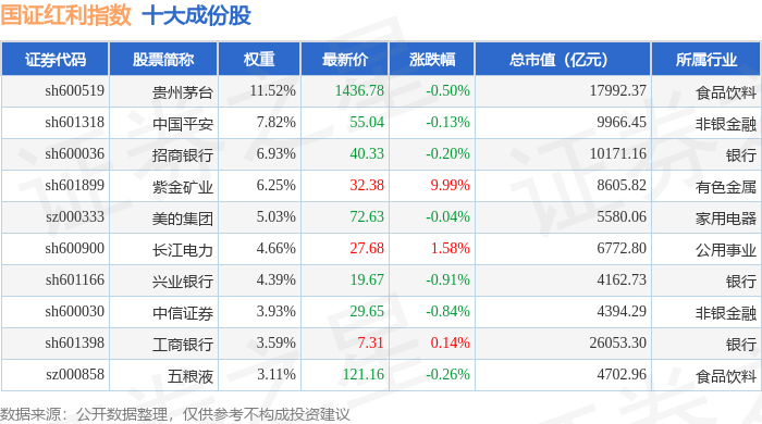 证券之星消息,10月9日,国证红利(399321)指数报收于7498.73点,涨1.05%,成交1187.6亿元,换手率0.43%。当日该指数成份股中,上涨的有29家,紫金矿业以9.99%的涨幅领涨,下跌的有19家,万科A以1.45%的跌幅领跌。