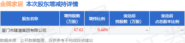 证券之星消息,10月9日金牌家居发布公告《金牌家居:金牌家居关于控股股东增持公司股份计划实施完毕的公告》,其股东厦门市建潘集团有限公司于2025年9月16日至2025年10月9日间合计增持67.62万股,占公司目前总股本的0.4384%,变动期间该股股价下跌3.39%,截止10月9日收盘报19.95元。
