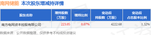 证券之星消息,10月9日南网储能发布公告《南网储能:南方电网储能股份有限公司关于控股股东全资子公司增持公司股份计划实施期限届满暨实施结果的公告》,其股东南方电网资本控股有限公司于2025年9月5日至2025年10月8日间合计增持223.05万股,占公司目前总股本的0.0698%,变动期间该股股价上涨15.72%,截止9月30日收盘报12.37元。