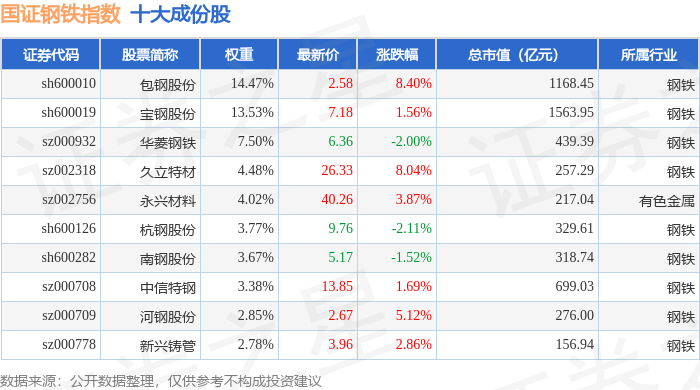 证券之星消息,10月9日,国证钢铁(399440)指数报收于1425.04点,涨3.18%,成交200.58亿元,换手率2.67%。当日该指数成份股中,上涨的有32家,哈焊华通以19.99%的涨幅领涨,下跌的有8家,武进不锈以3.34%的跌幅领跌。