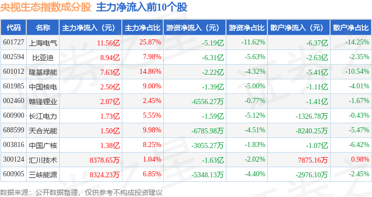 资金流向方面,央视生态(399556)指数成份股当日主力资金净流入合计1.32亿元,游资资金净流出合计9.59亿元,散户资金净流入合计8.27亿元。成份股资金流向详情见下表: