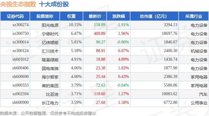 证券之星消息,10月9日,央视生态(399556)指数报收于2924.8点,涨2.35%,成交1295.18亿元,换手率1.67%。当日该指数成份股中,上涨的有39家,赣锋锂业以10.0%的涨幅领涨,下跌的有11家,惠城环保以6.37%的跌幅领跌。