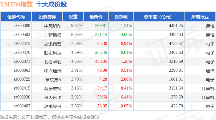 证券之星消息,10月9日,TMT50(399610)指数报收于9635.65点,涨1.43%,成交2618.79亿元,换手率4.07%。当日该指数成份股中,上涨的有36家,通富微电以10.01%的涨幅领涨,下跌的有13家,光线传媒以10.53%的跌幅领跌。