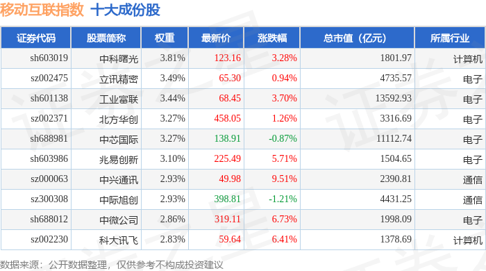 证券之星消息,10月9日,移动互联(399970)指数报收于4814.89点,涨2.34%,成交3629.74亿元,换手率4.28%。当日该指数成份股中,上涨的有80家,信维通信以14.73%的涨幅领涨,下跌的有18家,芒果超媒以6.68%的跌幅领跌。
