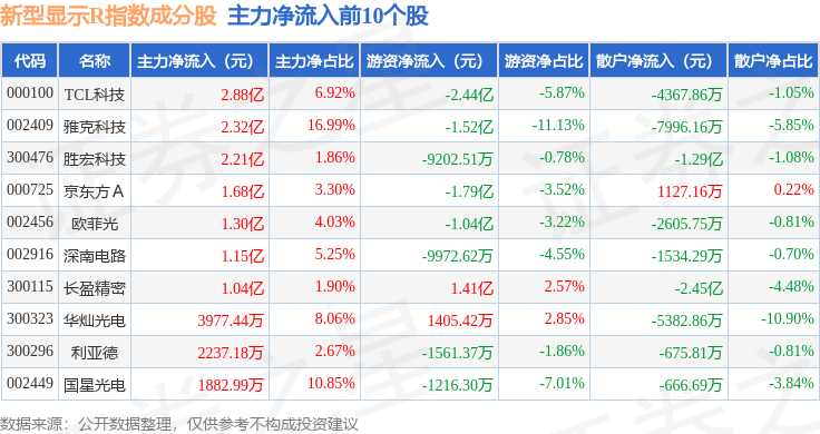 资金流向方面,新型显示R(470048)指数成份股当日主力资金净流出合计5.83亿元,游资资金净流入合计1.86亿元,散户资金净流入合计3.97亿元。成份股资金流向详情见下表: