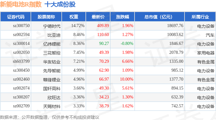 证券之星消息,10月9日,新能电池R(480032)指数报收于21924.15点,涨2.33%,成交1347.27亿元,换手率6.25%。当日该指数成份股中,上涨的有18家,赣锋锂业以10.0%的涨幅领涨,下跌的有12家,孚能科技以4.21%的跌幅领跌。
