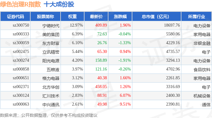 资金流向方面,绿色治理R(480058)指数成份股当日主力资金净流入合计9.29亿元,游资资金净流出合计23.01亿元,散户资金净流入合计13.72亿元。成份股资金流向详情见下表:
