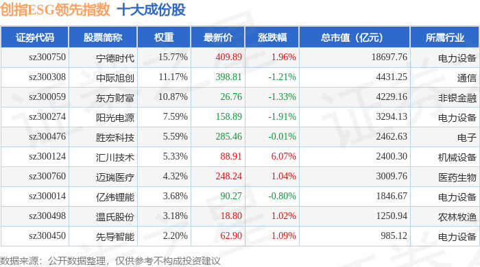 创指ESG领先(970031)指数十大成份股详情如下: