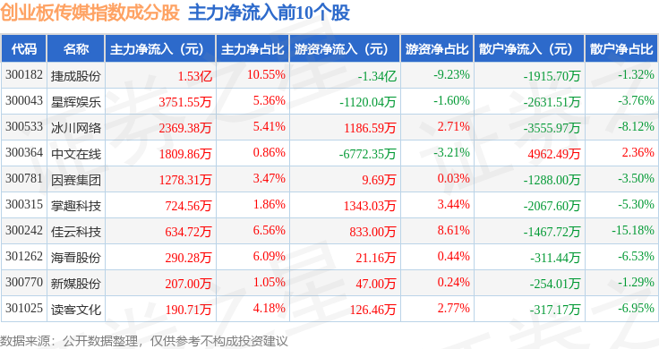 资金流向方面,创业板传媒(970084)指数成份股当日主力资金净流出合计12.19亿元,游资资金净流入合计3.76亿元,散户资金净流入合计8.43亿元。成份股资金流向详情见下表: