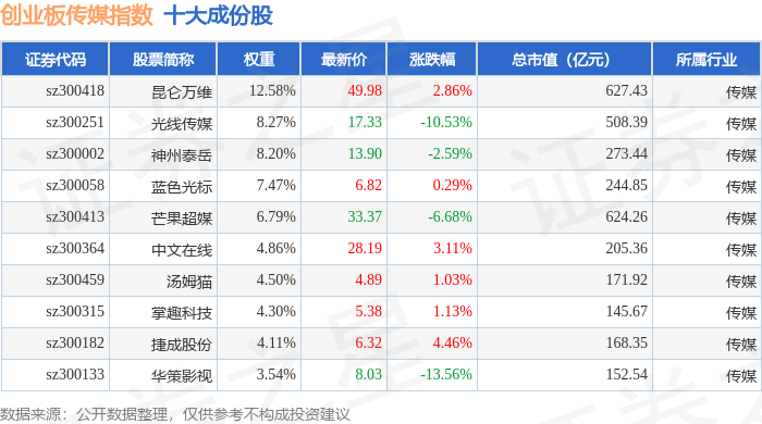 创业板传媒(970084)指数十大成份股详情如下: