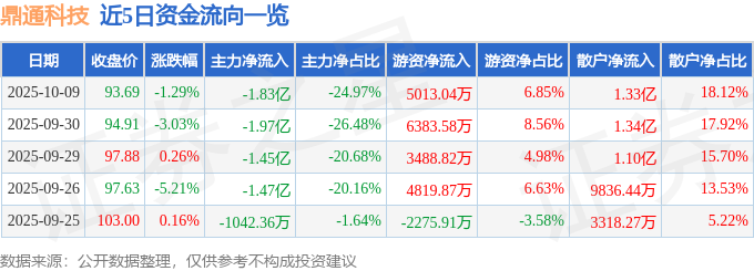 证券之星消息,截至2025年10月9日收盘,鼎通科技(688668)报收于93.69元,下跌1.29%,换手率5.57%,成交量7.76万手,成交额7.32亿元。