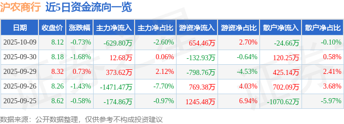 证券之星消息,截至2025年10月9日收盘,沪农商行(601825)报收于8.12元,下跌0.73%,换手率0.32%,成交量29.75万手,成交额2.42亿元。