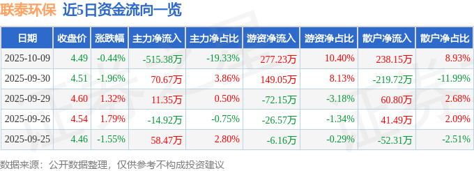 证券之星消息,截至2025年10月9日收盘,联泰环保(603797)报收于4.49元,下跌0.44%,换手率1.01%,成交量5.93万手,成交额2666.67万元。