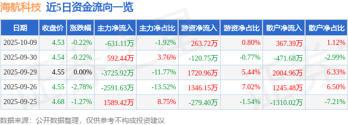 证券之星消息,截至2025年10月9日收盘,海航科技(600751)报收于4.53元,下跌0.22%,换手率2.75%,成交量70.71万手,成交额3.28亿元。