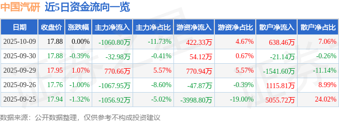 证券之星消息,截至2025年10月9日收盘,中国汽研(601965)报收于17.88元,上涨0.0%,换手率0.51%,成交量5.08万手,成交额9044.3万元。