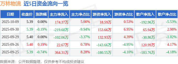证券之星消息,截至2025年10月9日收盘,万林物流(603117)报收于5.39元,上涨0.0%,换手率1.09%,成交量6.52万手,成交额3490.87万元。