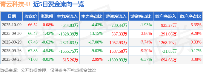 证券之星消息,截至2025年10月9日收盘,青云科技(688316)报收于66.52元,上涨0.08%,换手率4.57%,成交量2.19万手,成交额1.46亿元。