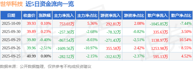 证券之星消息,截至2025年10月9日收盘,世华科技(688093)报收于39.93元,上涨0.1%,换手率1.33%,成交量3.49万手,成交额1.41亿元。