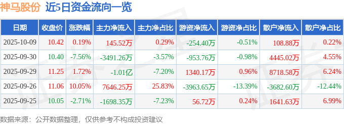 证券之星消息,截至2025年10月9日收盘,神马股份(600810)报收于10.42元,上涨0.19%,换手率4.79%,成交量48.13万手,成交额5.01亿元。
