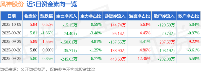 证券之星消息,截至2025年10月9日收盘,风神股份(600469)报收于5.84元,上涨0.52%,换手率0.61%,成交量4.42万手,成交额2570.71万元。